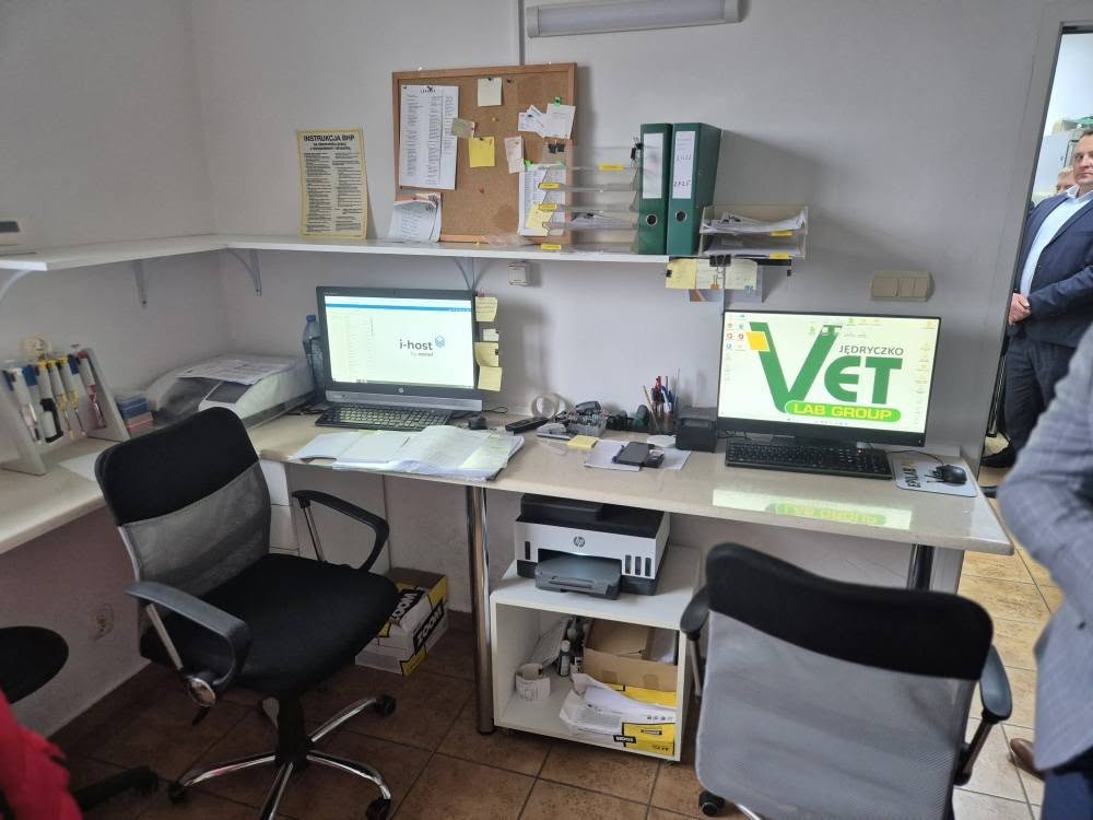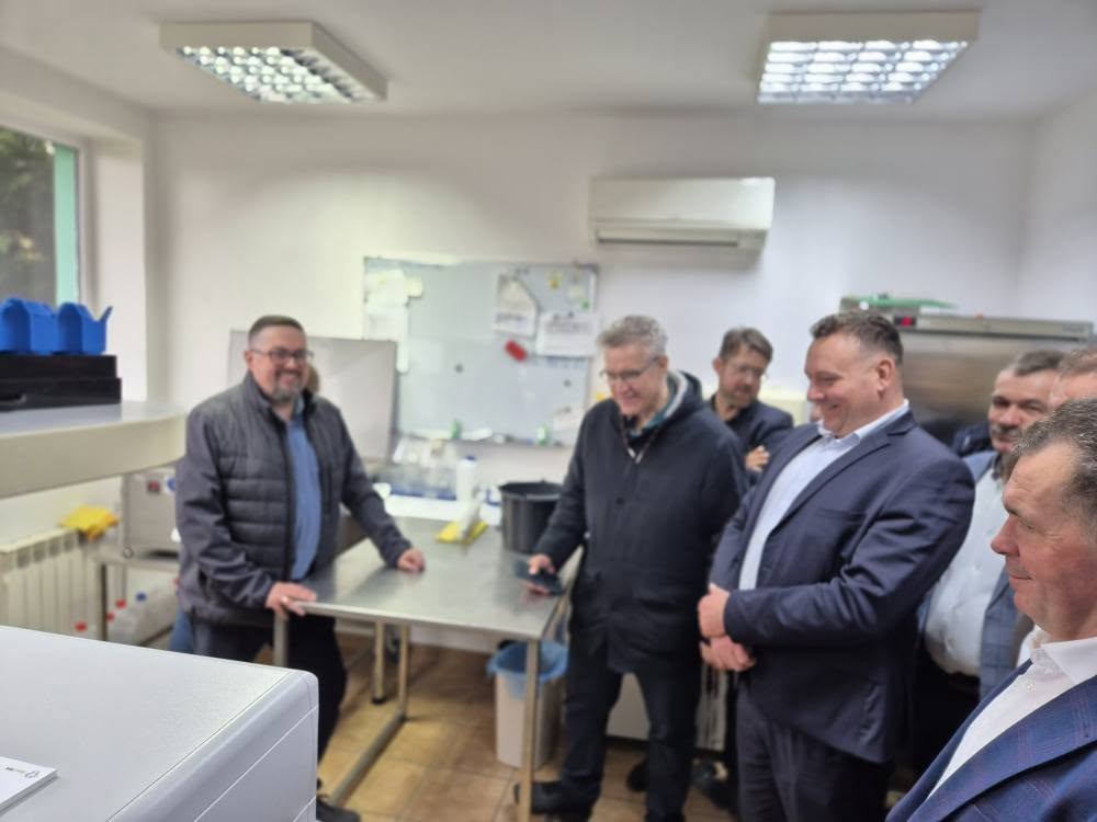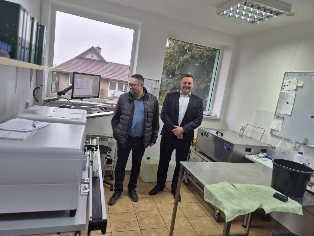 Odwiedziliśmy również laboratorium firmy Mlekolab , które wykonuje dla nas pobieranie i analizę próbek mleka. Podczas wizyty Pan Roman Jędryczko uroczyście ogłosił uzyskanie przez laboratorium akredytacji PCA oraz nadanie jego numeru. To ogromny sukces, który otwiera przed e-OCENA możliwość ubiegania się w Ministerstwo Rolnictwa i Rozwoju Wsi o zatwierdzenie programu hodowlanego dla bydła mlecznego.